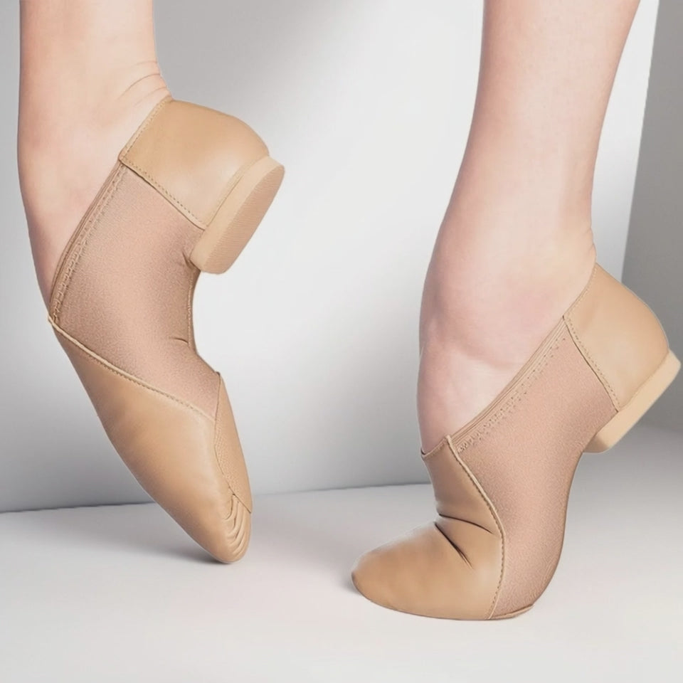 So Danca's top selling jazz shoe is a hot seller for a reason! Discover the difference a perfect fit makes. Our top-selling jazz shoe is designed to give your feet a hug, with arch-hugging neoprene that offers incredible flexibility and smooth, superior leather that feels amazing. The unique "cup the heel" technology ensures zero slippage, so you can focus on your artistry and not your footwear.